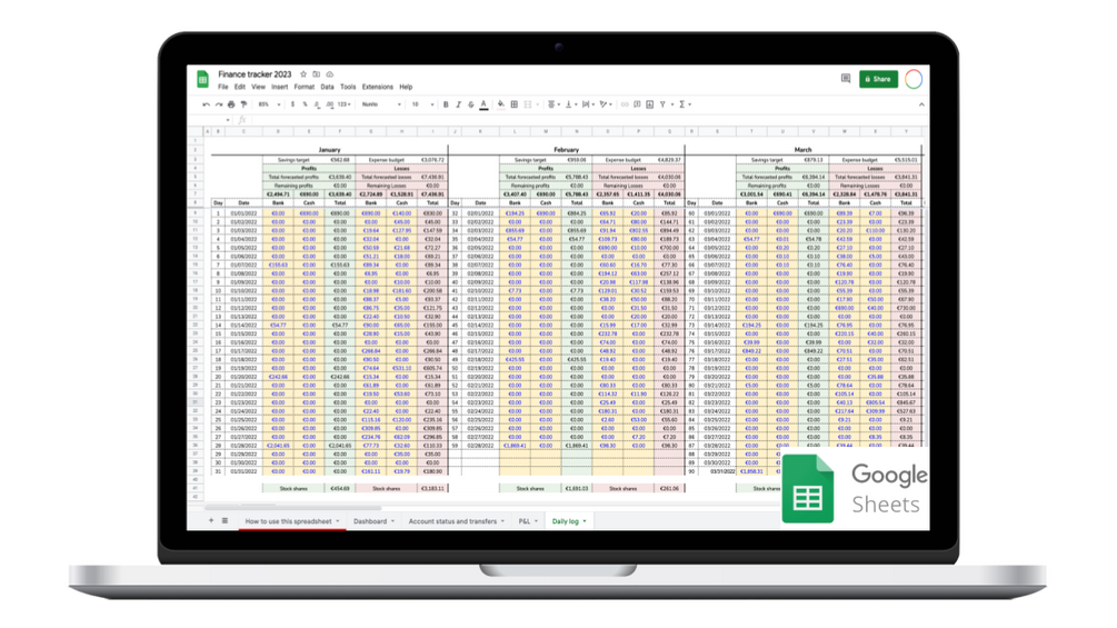 With its dashboard, account status & transfer tab, P&L tab and daily log tab, the finance tracker allows you to track every single cent that comes in and out of your bank accounts.